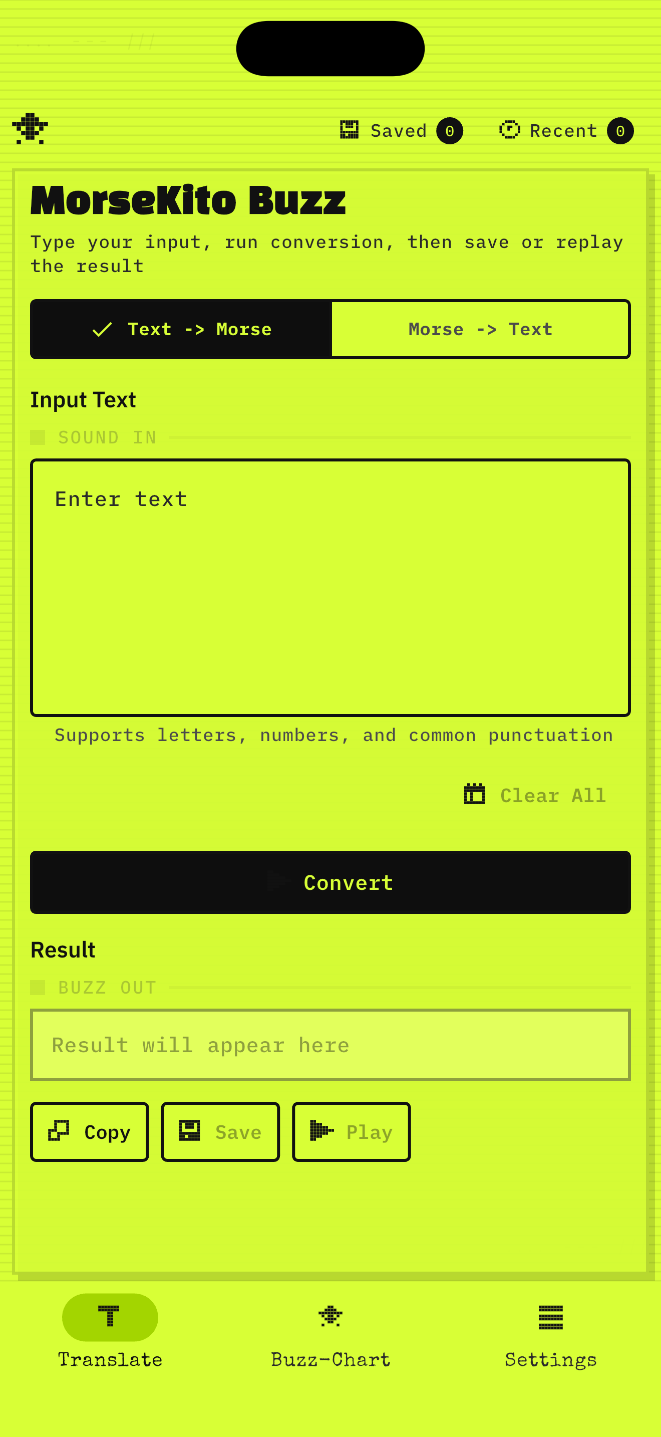 - Text to Morse: ์ ๋ ฅํ ํ ์คํธ๋ฅผ ์ฆ์ ์ ํํ ๋ชจ์ค ๋ถํธ ์ ํธ๋ก ๋ณํํฉ๋๋ค.
